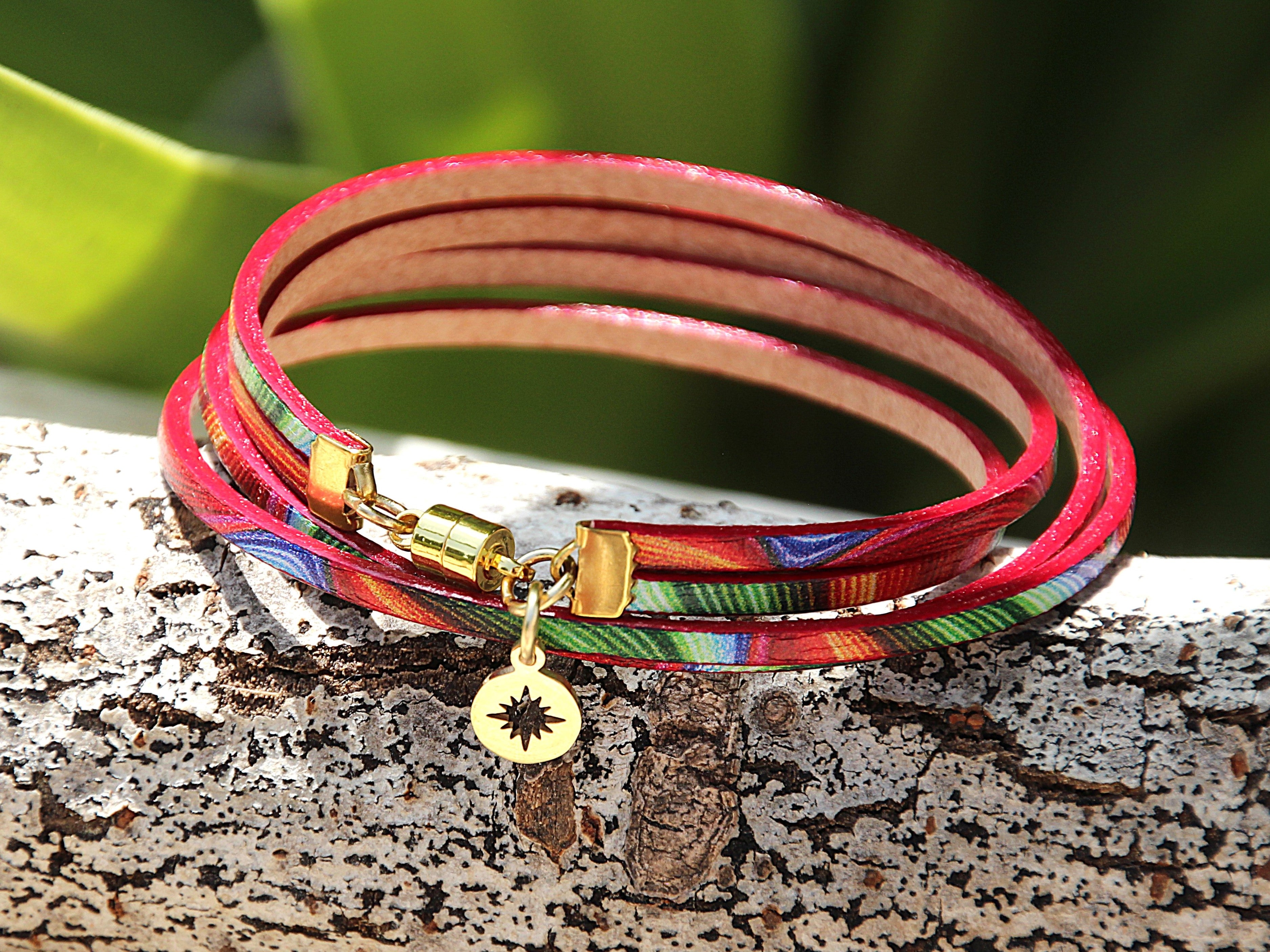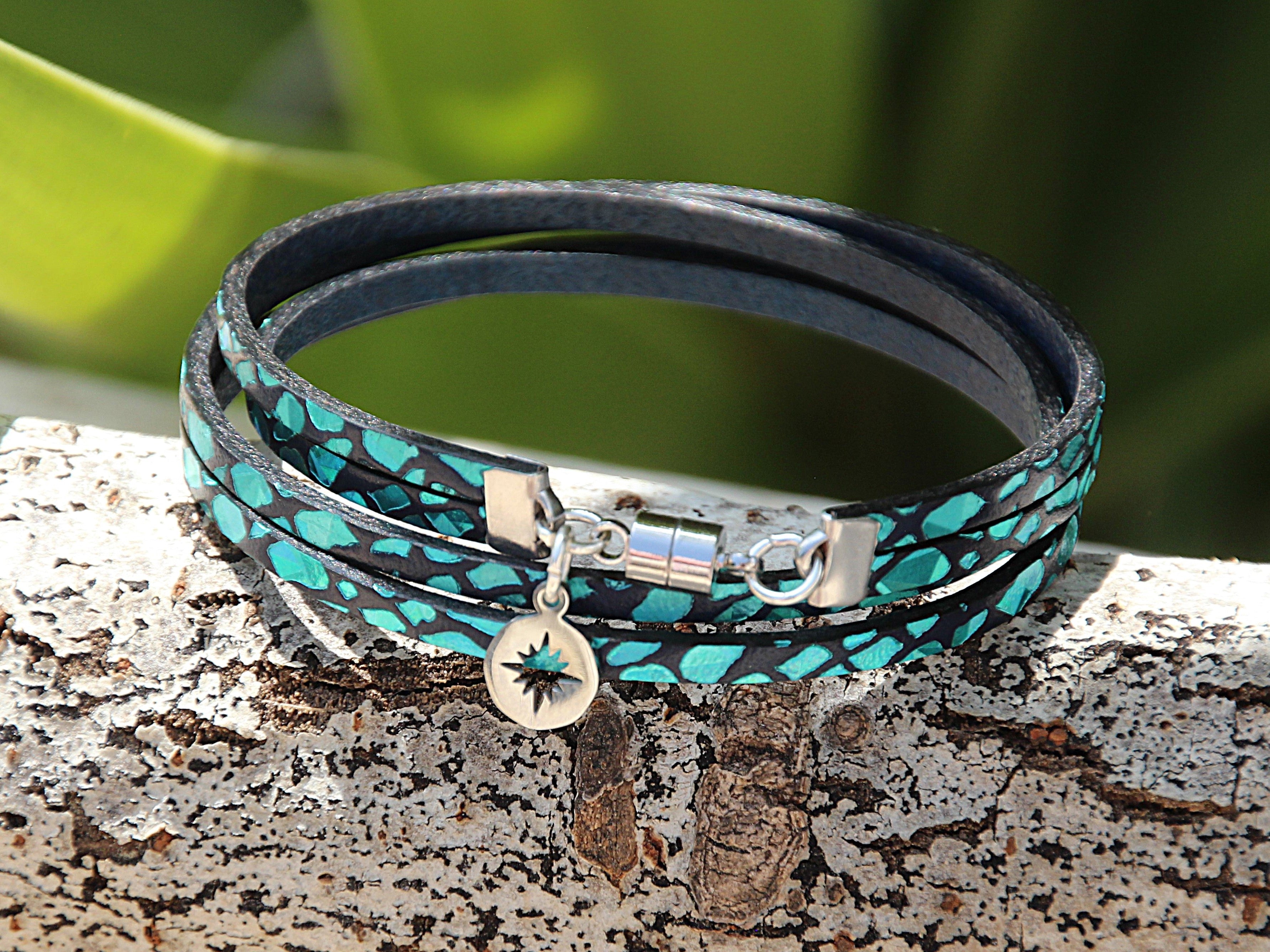 HOT COUTURE est un bracelet rock, moderne et affirmé. Double ou triple tour en cuir serti de billes métalliques, monté sur un fermoir magnétique en acier inoxydable il s'agrémente d'un ornement finissant le bracelet.